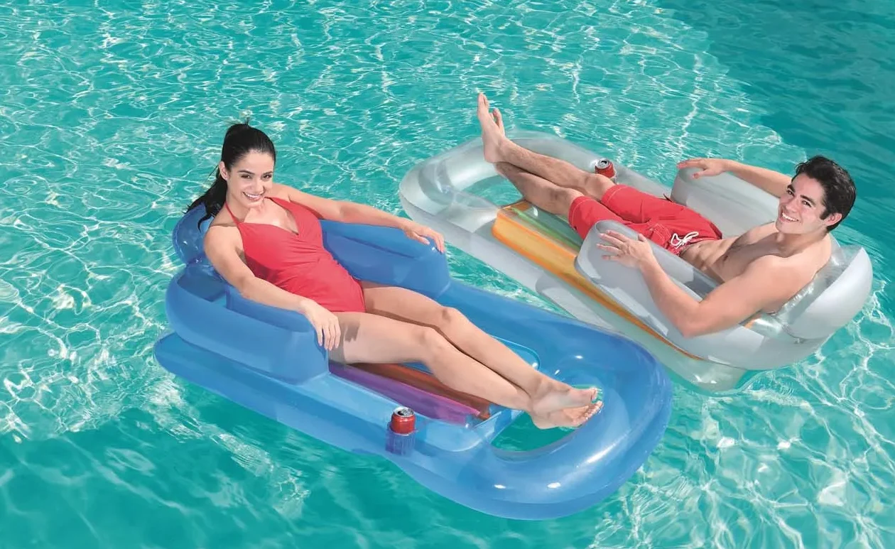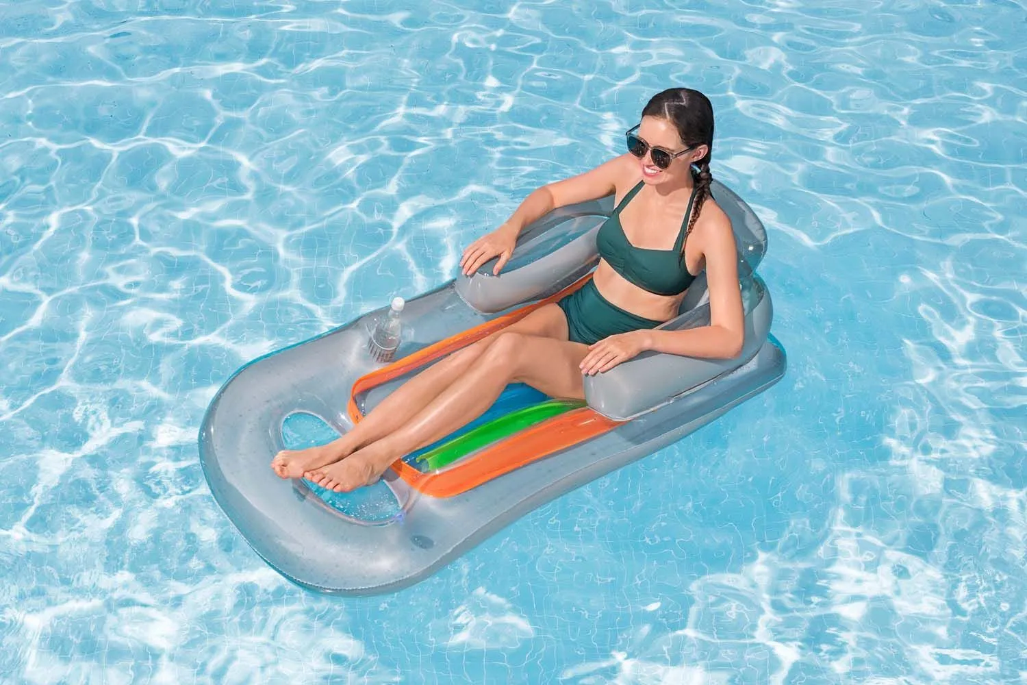 This air lounger offers a comfortable and relaxing surface for your days by the pool or at the beach. But what really sets the Summer Colors™ with Backrest apart is its transparent surface with a vibrant internal support structure, creating a fun and appealing look. Sit back and relax in style and comfort. The air lounger features a clever opening at the foot end that allows you to dip your legs in the cool water. With inflatable back, head, and armrests, the Summer Colors™ with Backrest offers the ultimate relaxation experience. The air lounger inflates in a snap and is easy to transport and store, so you can always have it with you when you head out for a trip to the water. In each package, you’ll find not only the air lounger itself, but also a handy repair patch, so your water fun never ends.