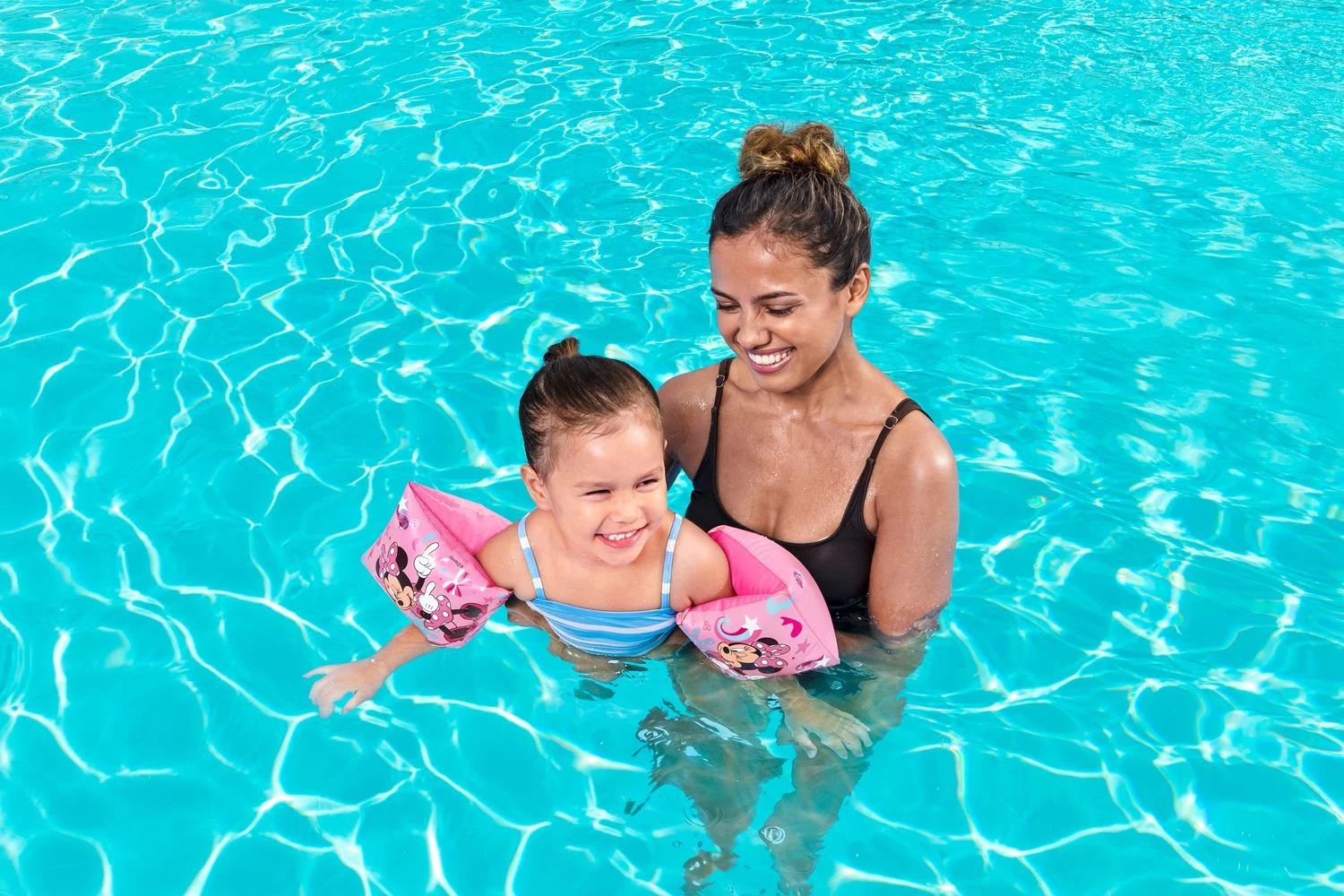 The water adventure can begin with the Disney JuniorĀ® Minnie Mouse water wings. These arm float are perfect for children aged 3-6 years. They will put a smile on your child’s face and boost their confidence as they practise their swimming skills and gain more and more confidence in the water in these flexible but comfortable water wings. The arm float have a double feathered edge skirt air chamber for extra safety and buoyancy, so your child can feel safe. They are effortless to inflate, deflate and store, so you can easily stow these buoyancy aids in your beach bag for next time. Learning to swim has never been so safe and fun!