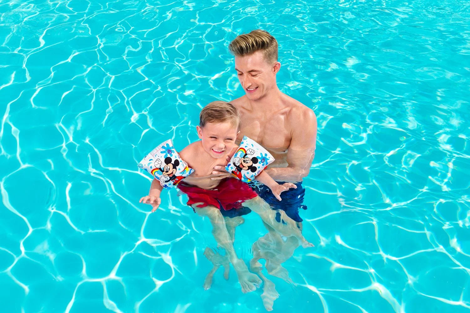 Mickey Mouse, the best friend of all! With these Disney JuniorĀ® Mickey & Friends Mickey Mouse water wings, your children can take their best friend with them to learn to swim. The arm float with the iconic character are perfect for children aged 3 to 6 years. They will put a smile on your child’s face and boost their confidence as they practise their swimming skills in these flexible but comfortable water wings. The arm float have a double feathered edge skirt air chamber for extra safety and buoyancy so that your child can feel more comfortable in the water every day. They are effortless to inflate, deflate and store, so you can easily stow them in your beach bag for next time. Learning to swim has never been so safe and fun!