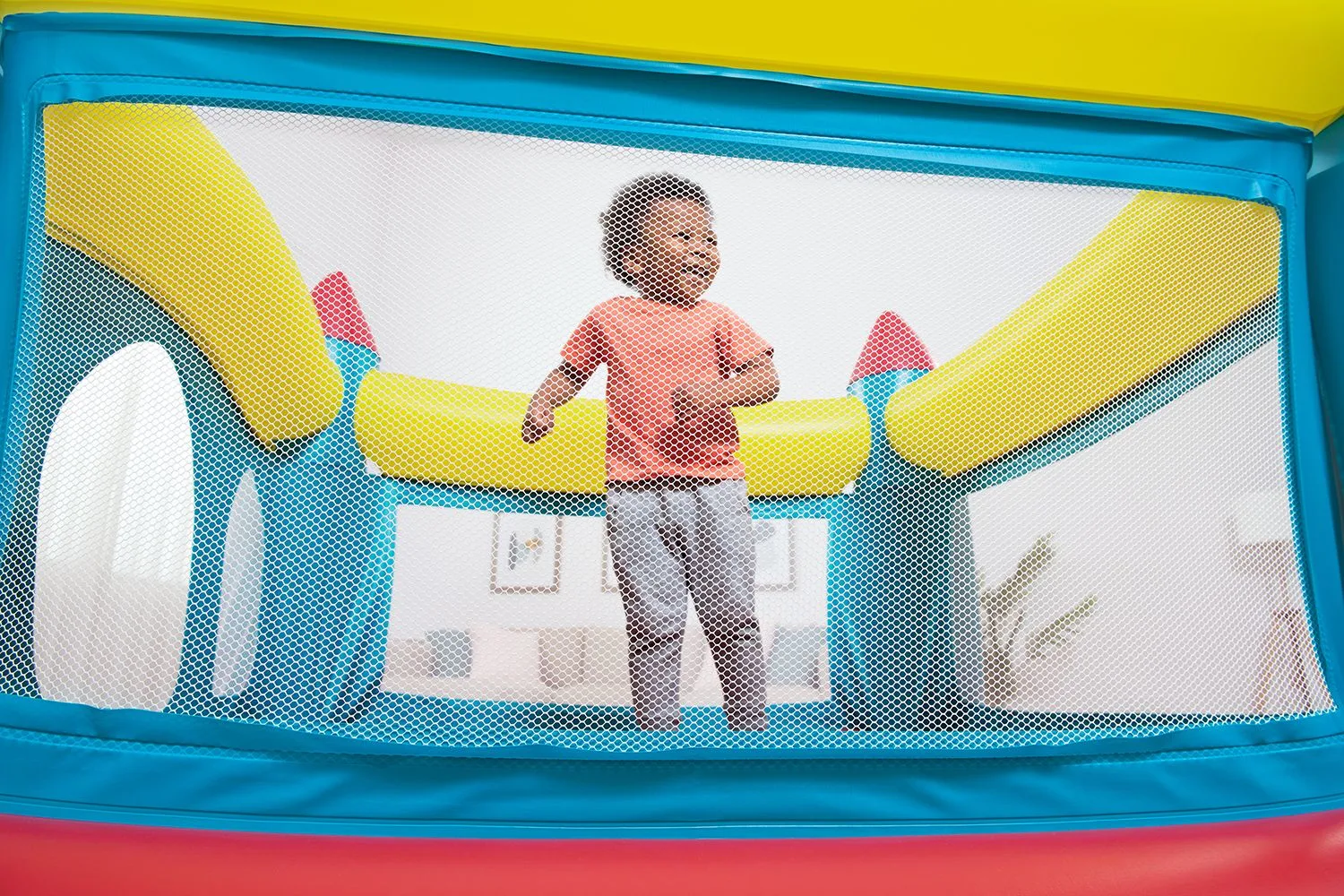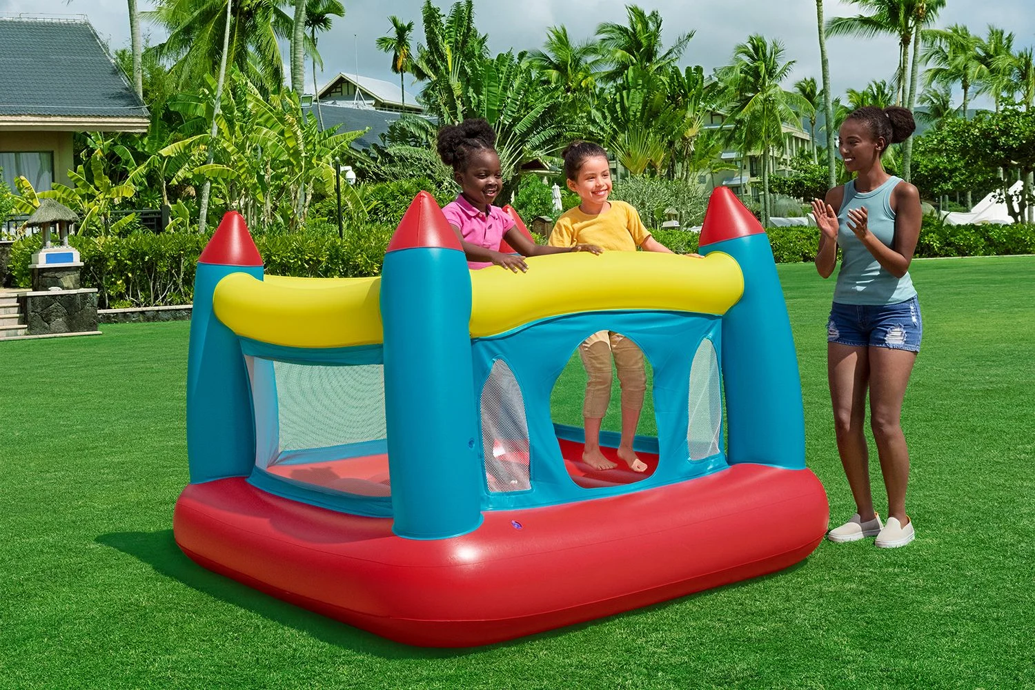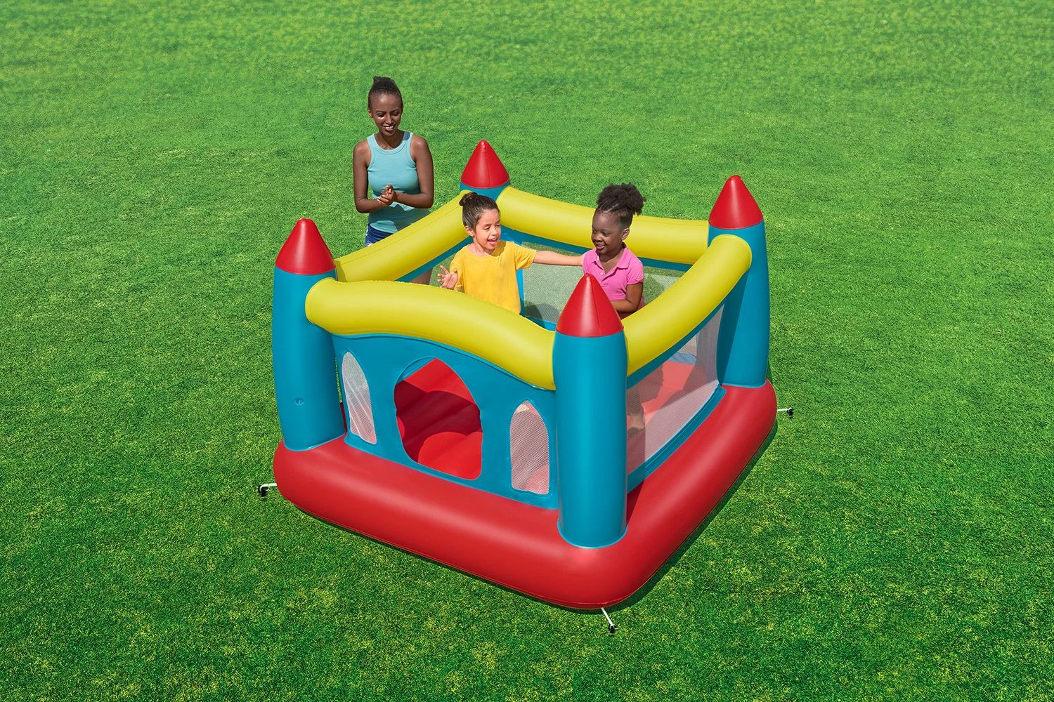 Guaranteed royalty with the Bestway® bouncer Royal Leap™! It offers a majestic jumping adventure. Made from durable PVC, it supports up to 85kg and is ideal for children aged 3+. This bouncer has been for indoor & outdoor use designed to maximise playtime fun. The bouncer offers space for up to 3 children and is equipped with mesh side walls that make supervision easier for parents and increase the feeling of safety. The delivery includes not only the bouncer itself, but also 4 pegs for a firm hold outdoors and a practical repair patch in case of minor mishaps. Create a royal experience for your little ones with the Bestway® bouncer Royal Leap™!