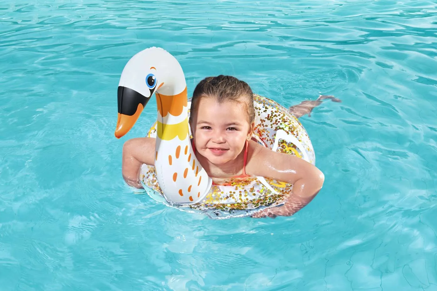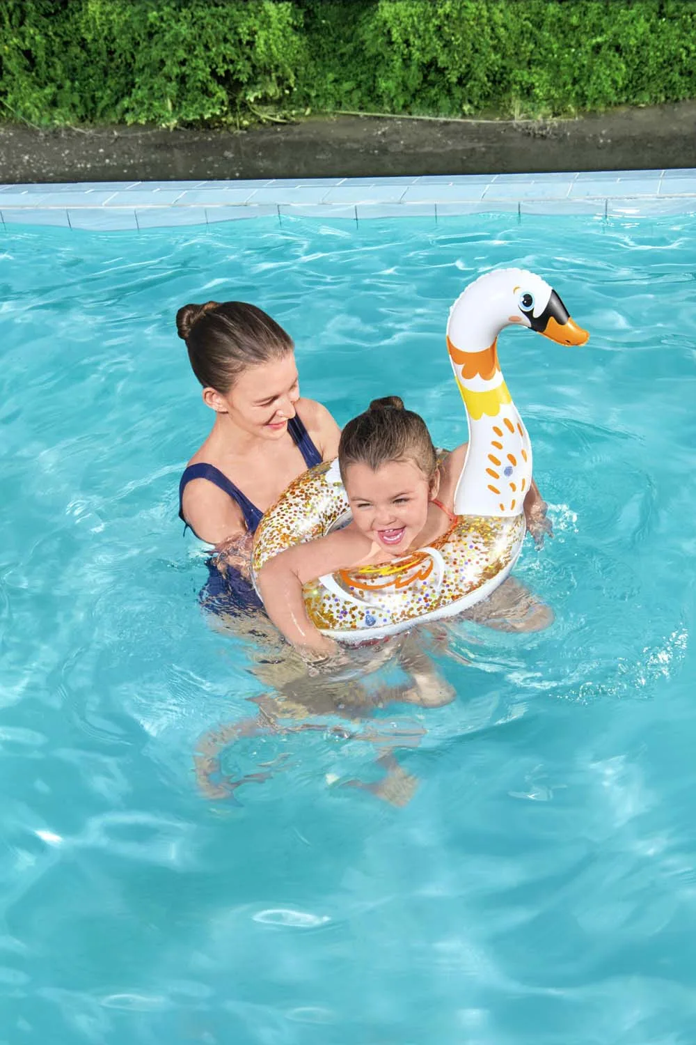 Glide relaxed into every summer with this shimmering Bestway® swim ring ! The long, elegant neck of this animal float is perfect for holding on to or leaning against. This swim ring is equipped with air chambers, which make inflation and deflation much easier and specifically support buoyancy in the water. Made from pre-tested, durable material to ensure the swim ring lasts for several summers. The ring is filled with shimmering glitter that is guaranteed to add sparkle wherever it goes.
