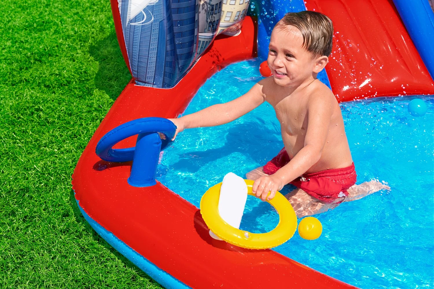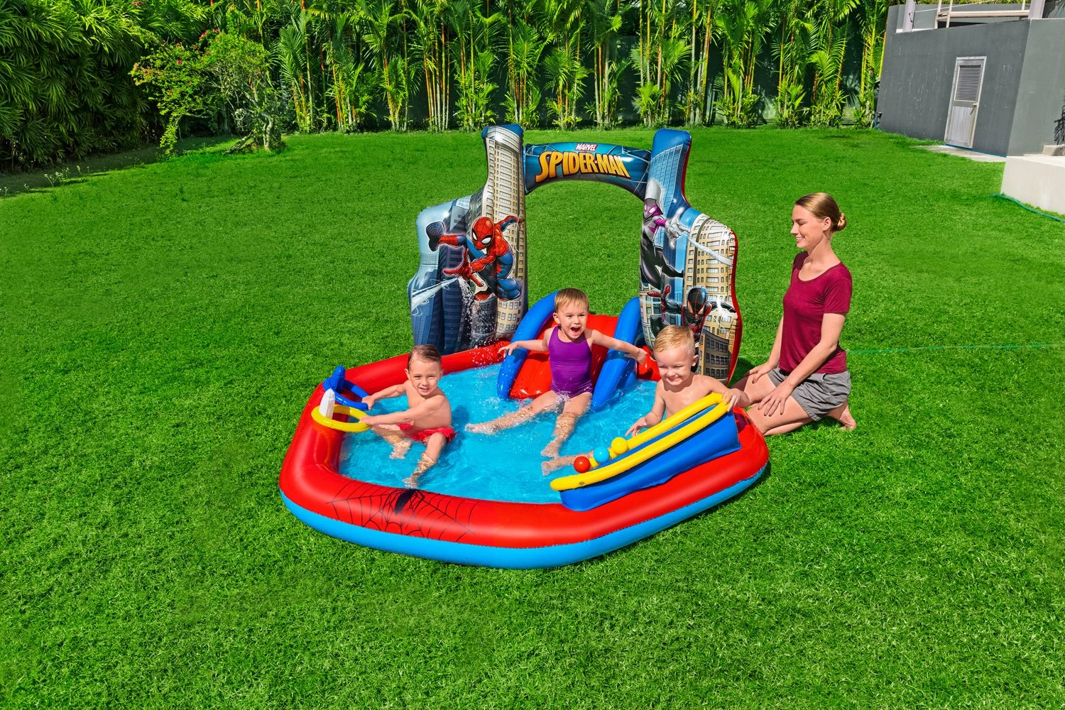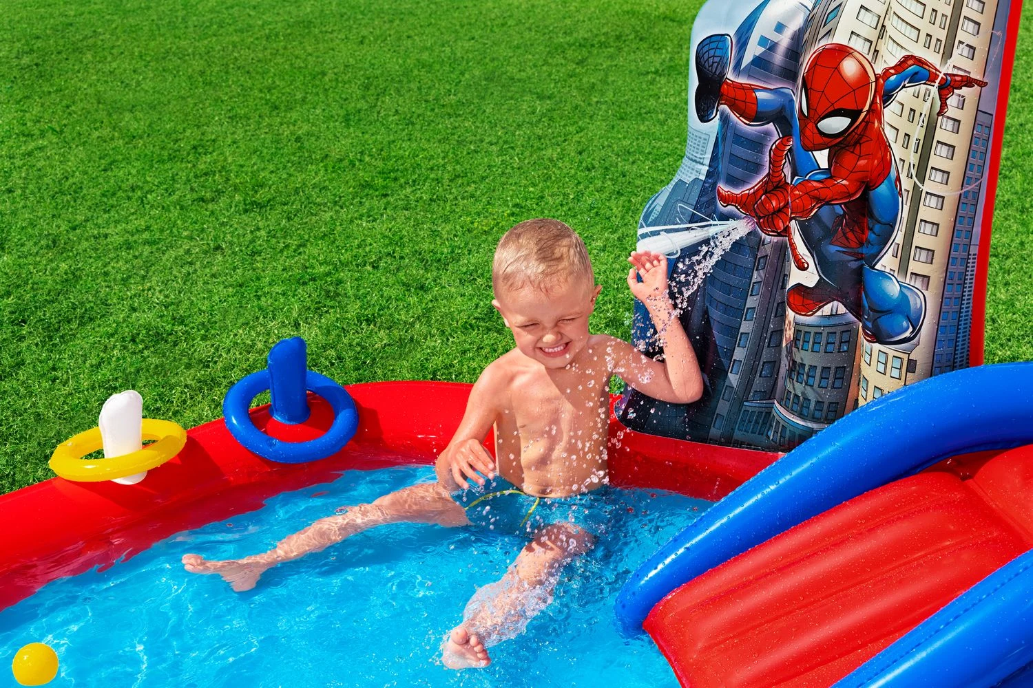 Spider-Man™, the popular superhero, is ready for action with the play center! Simply inflate effortlessly and fill the pool with up to 165 litres of water, connect a garden hose (not included) to the archway to activate the sprayer and let the adventure begin.